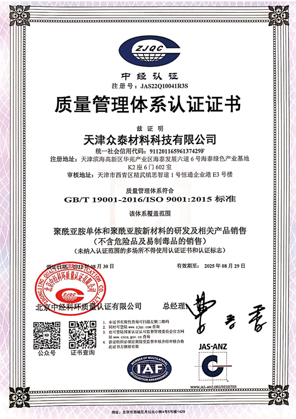 天津眾泰材料科技有限公司(以下簡稱“眾泰”),是一家“以先進功能性聚酰亞胺單體研發(fā)生產為核心,致力于推動全球聚酰亞胺材料產業發(fā)展”為使命的創新型高新技術企業。眾泰研制的聚酰亞胺單體目前已廣泛應用于無色透明柔性聚酰亞胺薄膜、柔性顯示材料、5G新材料等諸多高科技領域產品的生產。